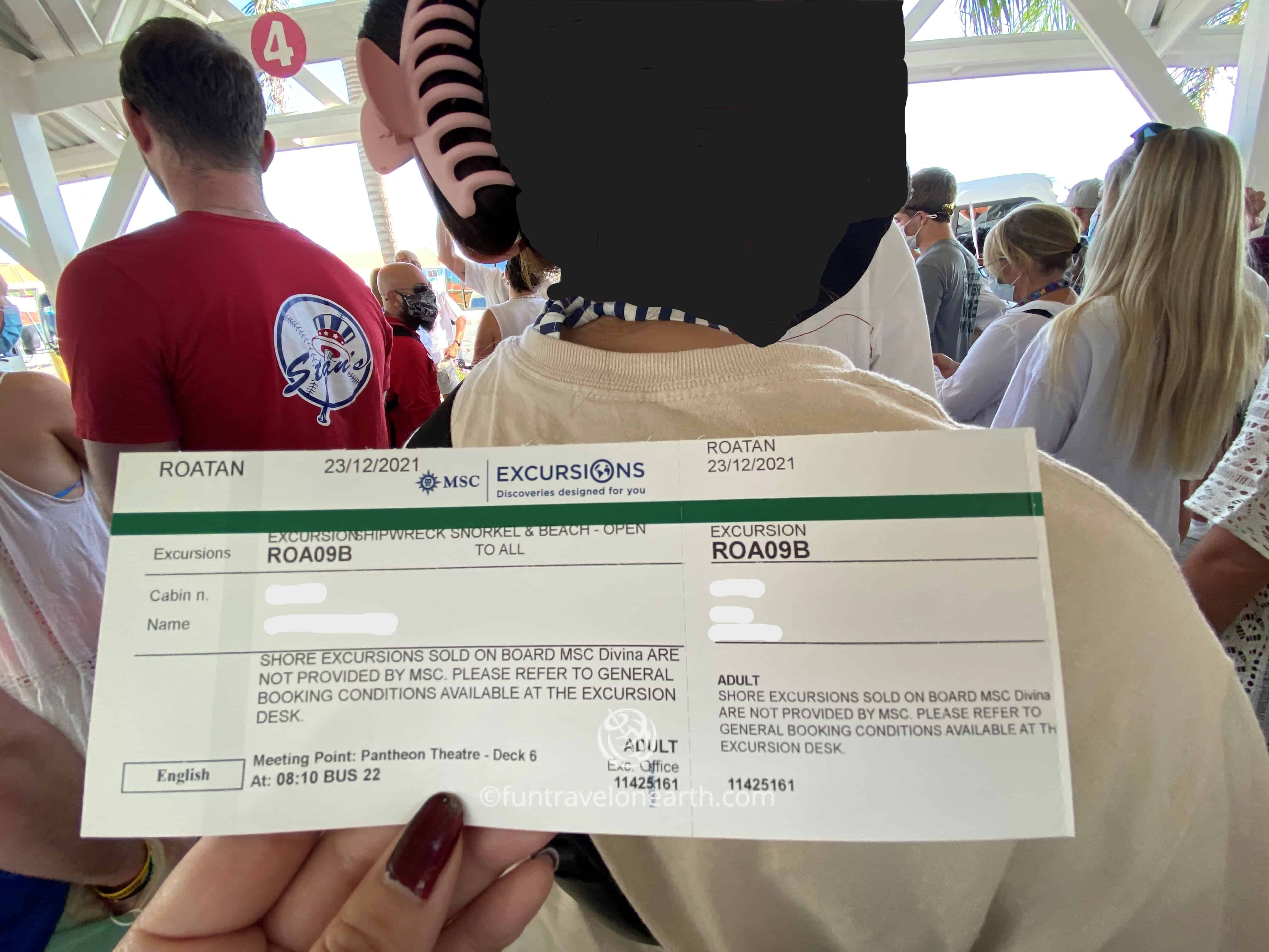 クルーズ船のツアーゲストは、ツアー内容によって20~30人程度のグループに分けられます。FLKへは各グループごとにシャトルバスで向かいますが、各グループにひとりコーディネーターがつきました。彼は、フレンドリーで、手際のよい手腕でした。SHIPWRECK SNORKELを、自由時間の前にするか後にするかについて、FLKに向かう水上シャトル内で多数決をとり、その結果FLK島に着いたらすぐ、自由時間の前にSHIPWRECK SNORKELをすることになりました。